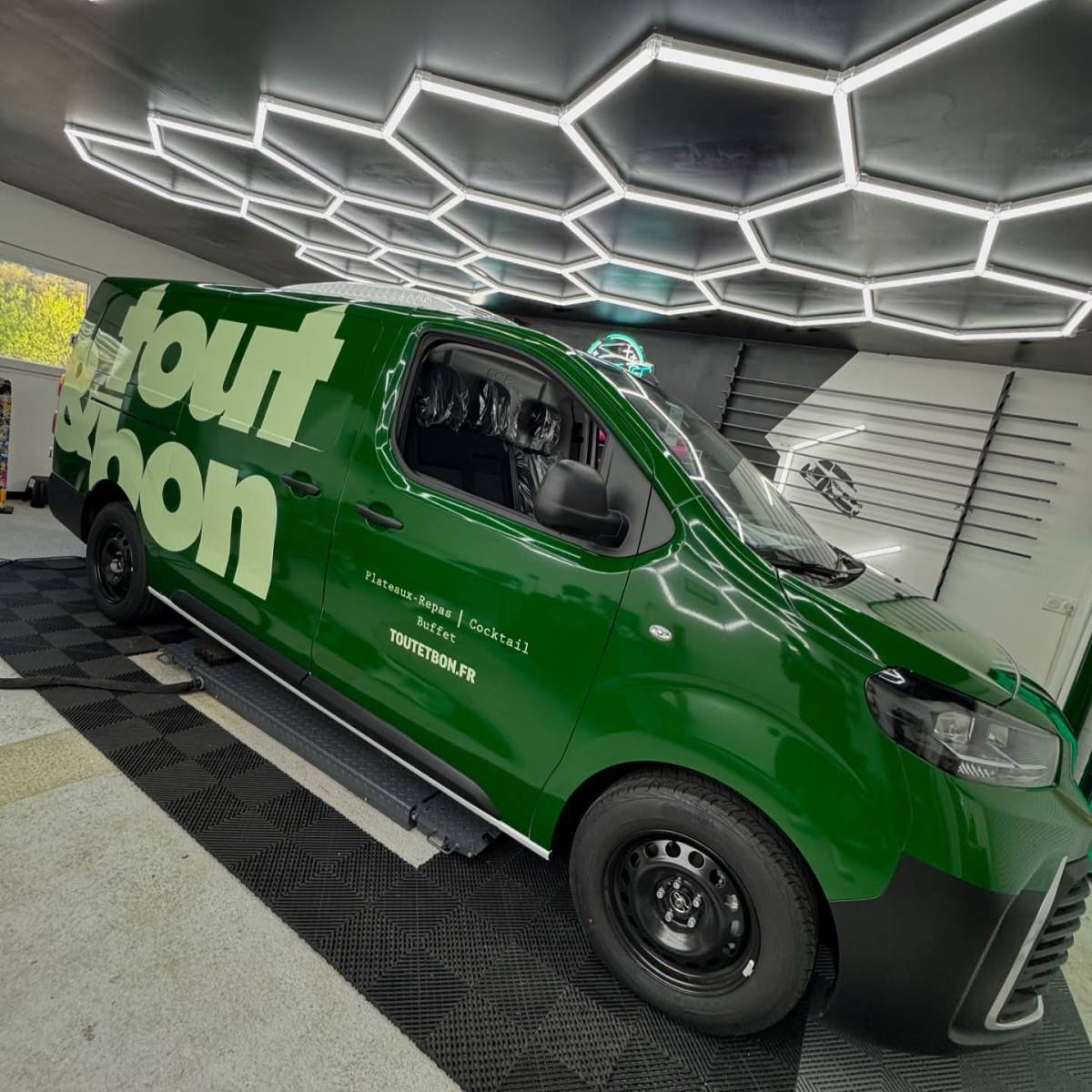 Chez UM Cover, on aime les projets qui sortent du lot, comme ce Toyota Proace entièrement habillé d’un covering vert foncé, accompagné d’un marquage publicitaire aux couleurs de la franchise “Tout est bon”. Un utilitaire qui ne passe pas inaperçu dans les rues de Dijon !